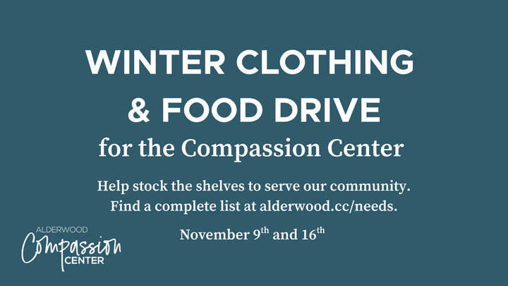 This is also a Food Drive to stock the pantry at the Compassion Center. You can visit alderwood.cc/needs for a more extensive list of needs.